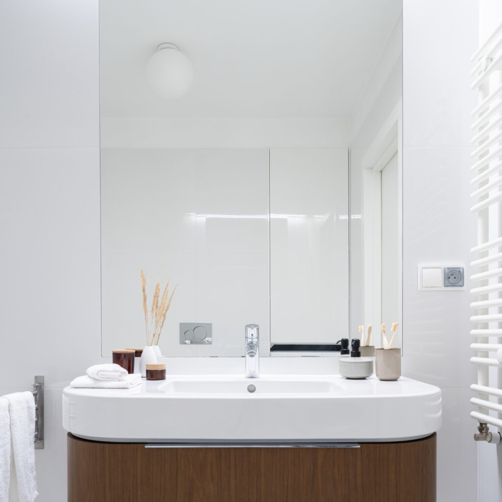 鏡を大きくしたり、収納スペースを広くしたり、起床後や帰宅時、気分のリフレッシュに効果あり。費用は10万から30万円程度が目安となります。現在より大型の洗面台にする場合、洗濯機の設置場所等他のスペースを圧迫しないかも要確認です。水回りの中では比較的傷みにくい場所ですが、洗面台に接続する給排水管は劣化している可能性があります。漏水などに繋がるリスクもあるので、それらも確認しての施工範囲を決めるのも大切です。